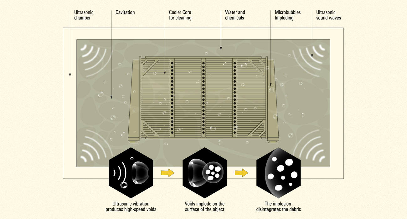 This action produces high-pressure jets and microstreaming that penetrates even the smallest crevices and pores, dislodging dirt, grease, scale, and other deposits from cooler surfaces.
